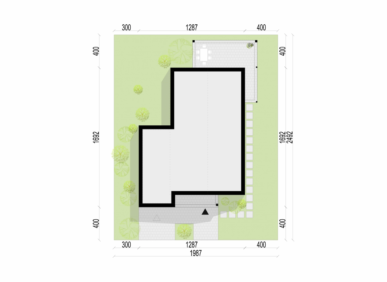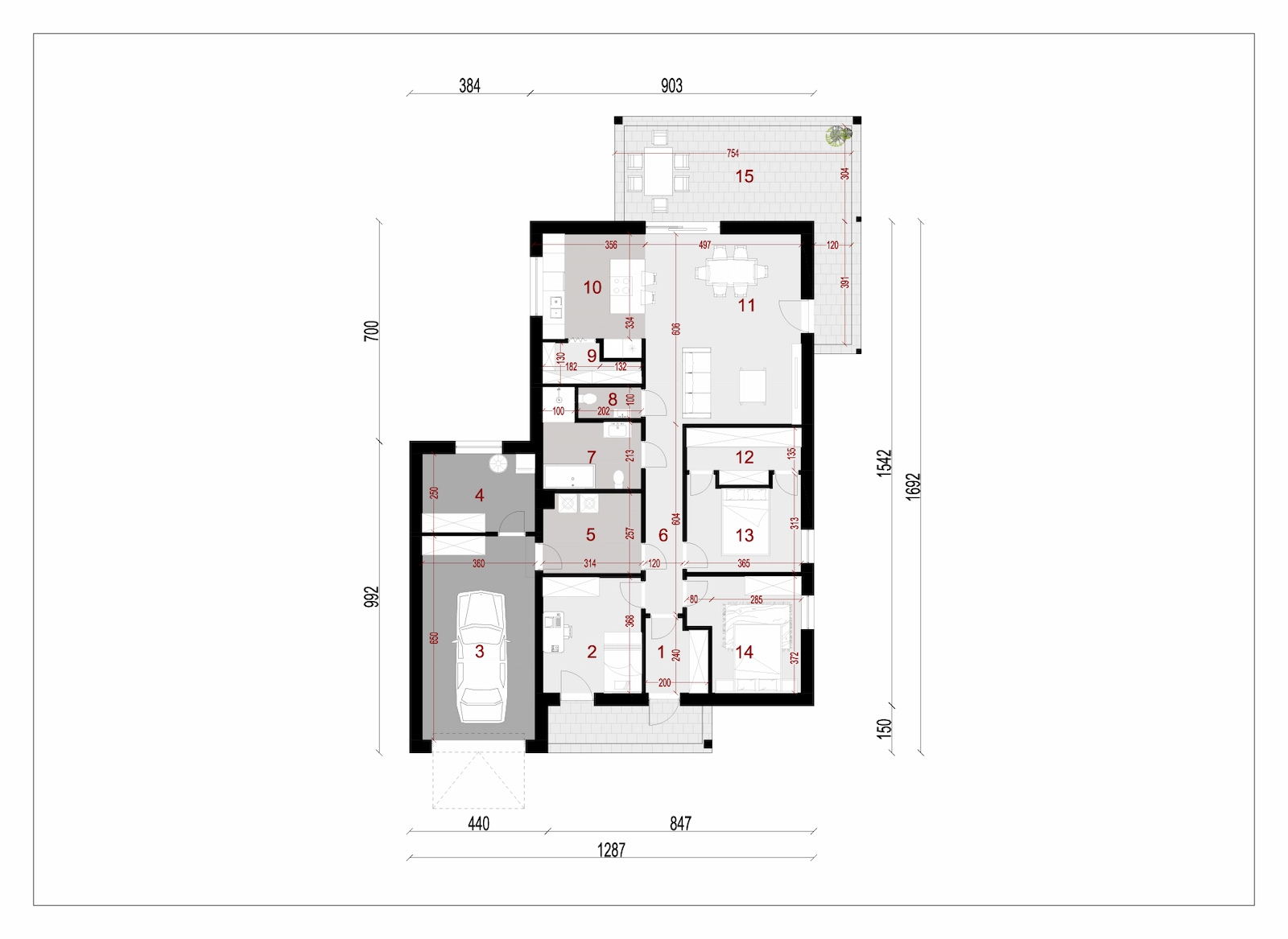 Gotowy projekt domu PRZEMYŚLANY 16 to wyjątkowa propozycja dla osób poszukujących funkcjonalnego i estetycznego parterowego domu jednorodzinnego. Dzięki inteligentnym rozwiązaniom, takim jak osobna pralnia, spiżarnia przy kuchni, zadaszony taras oraz komfortowy garaż jednostanowiskowy, projekt ten zapewnia wygodne życie na jednym poziomie. Przemyślany układ pomieszczeń oraz duże przeszklenia tworzą przestronne i jasne wnętrza, które sprostają wymaganiom współczesnych rodzin. Gotowy projekt domu Przemyślany 16 spełnia najbardziej wyszukane gusta!
